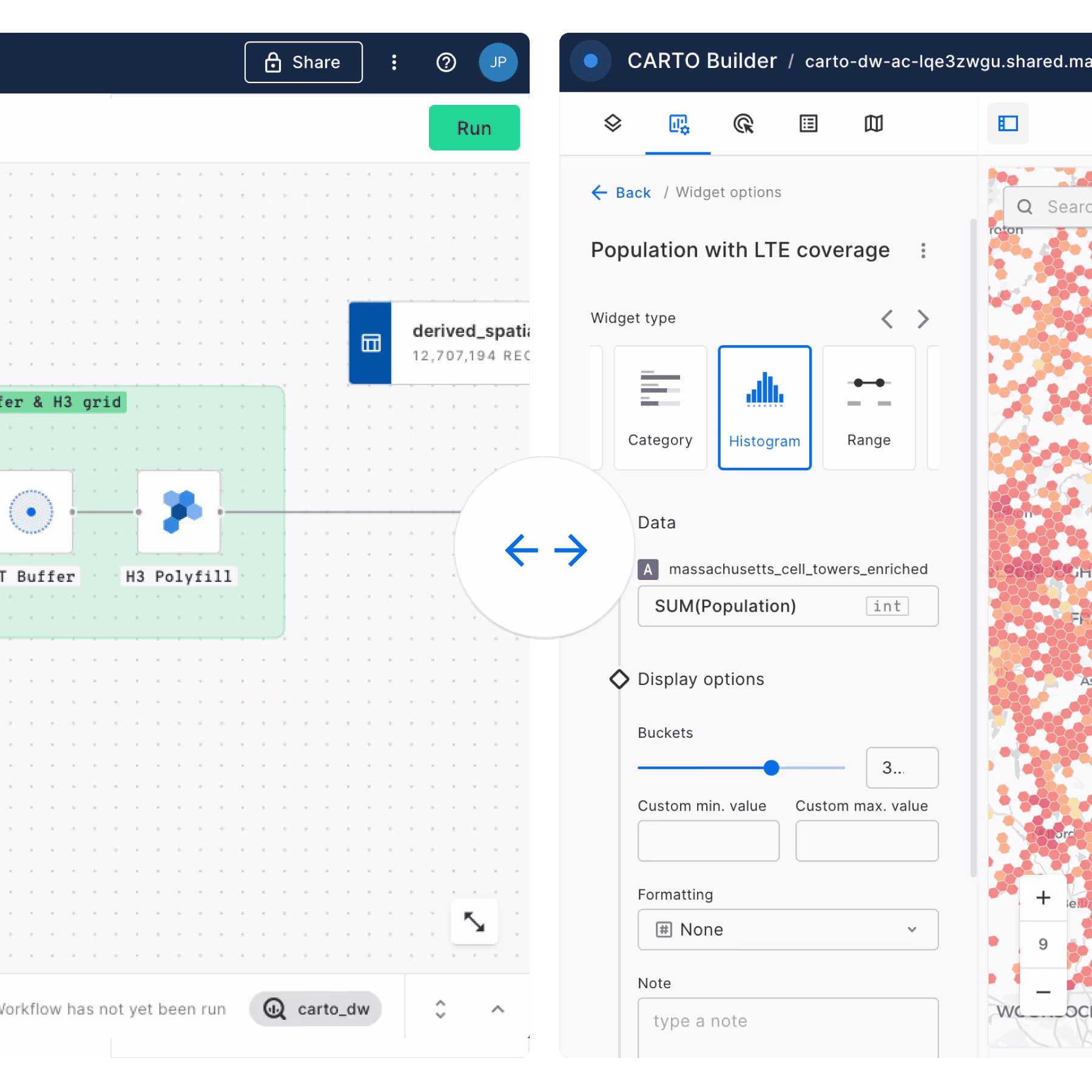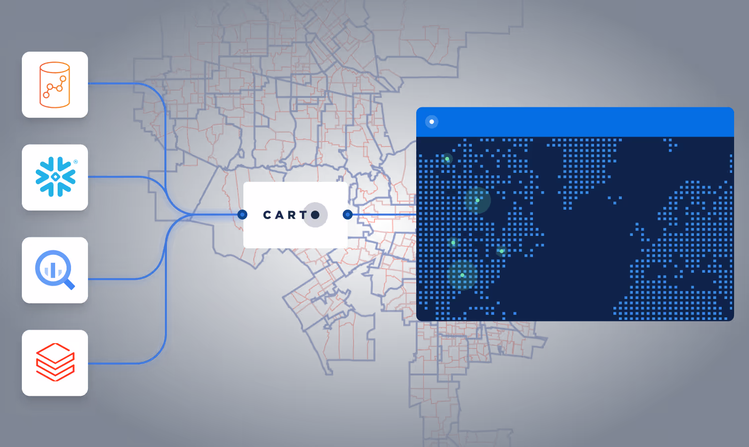 CARTO extends the analysis and visualization capabilities available in BigQuery, Snowflake, Redshift, Databricks, and more. No need to pull data into our platform, unlike other Business Intelligence or modeling tools. Access a single, secure source for all your data giving you speed and agility, with no limits on data scale.