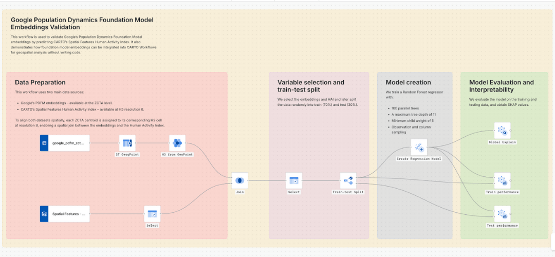 - Seamless integration: PDFM and AlphaEarth embeddings are available as components within the CARTO Workflows canvas.