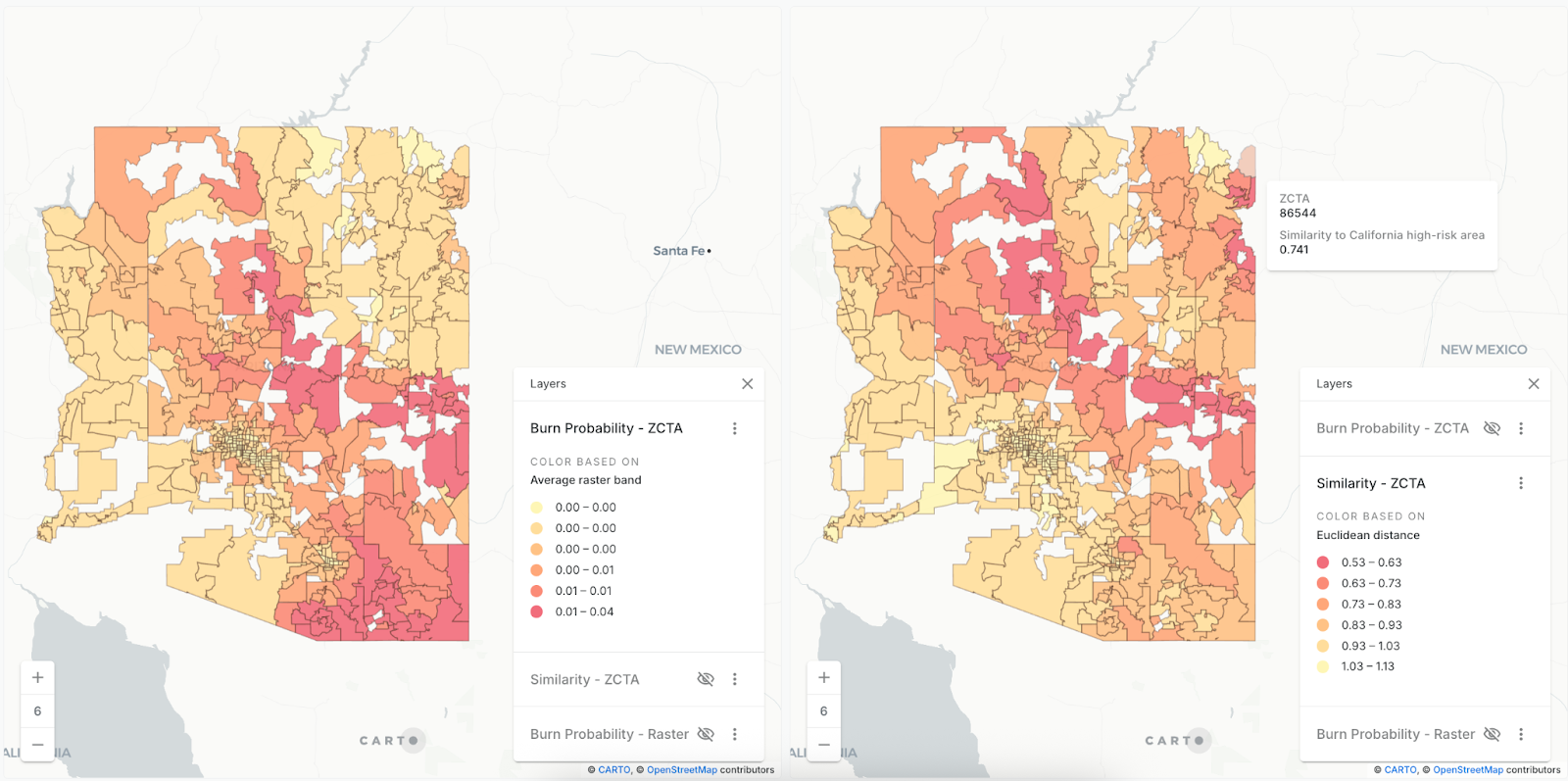 To validate the results, we compared the obtained similarities with the burned probability estimates provided by the Wildfire Risk to Communities model [2]. We first summarized the raster values to ZCTAs to then compute the Spearman's rank correlation coefficient between the two, obtaining a value of 0.748.