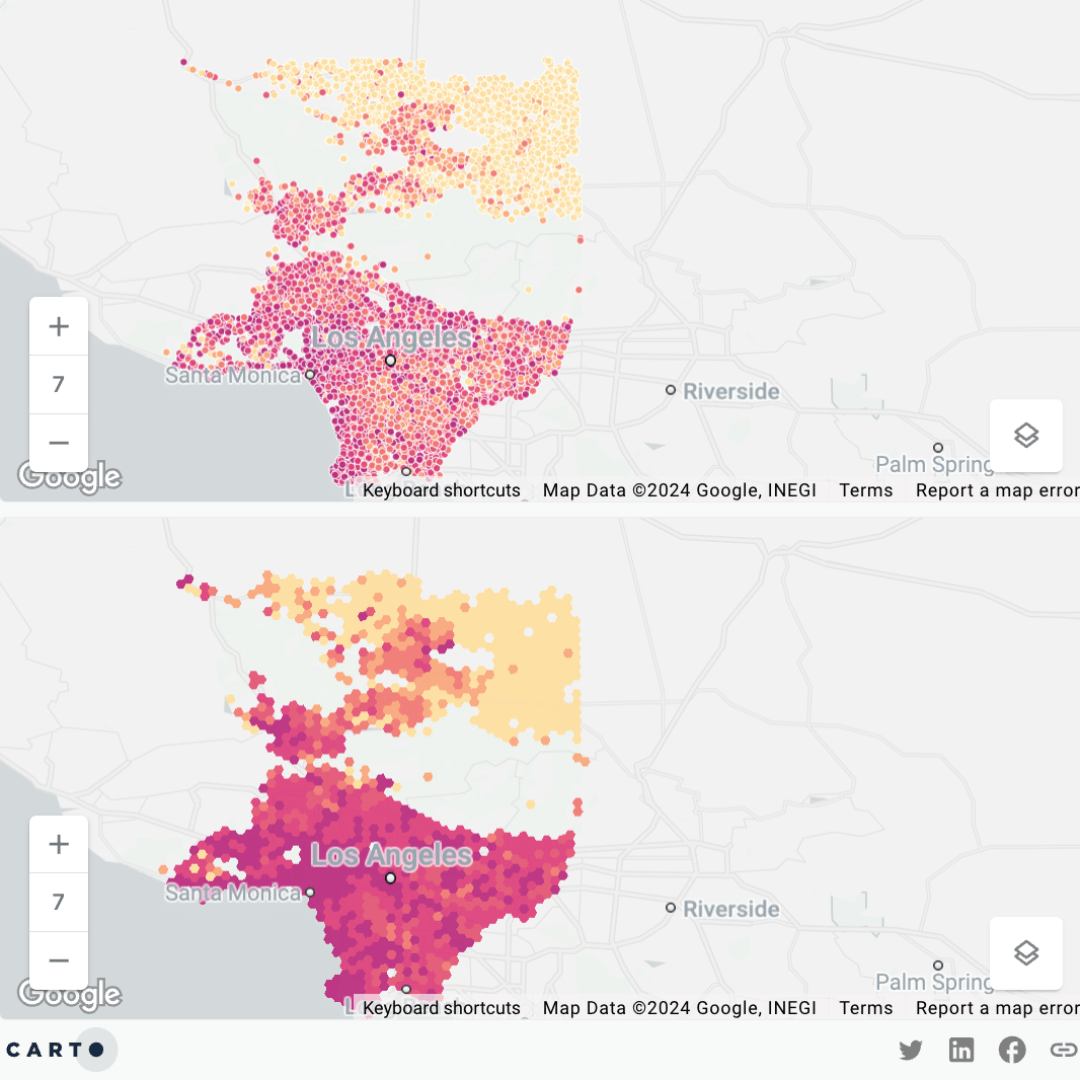 With our mapping platform CARTO Builder you can visualize H3 natively, allowing you to quickly visualize millions of features! You can also take advantage of some of our Spatial Index-specific data visualization features, such as the ability to change the resolution that H3 cells are rendered at. This rendering of massive spatial data is made even more seamless through our dynamic tiling functionality.