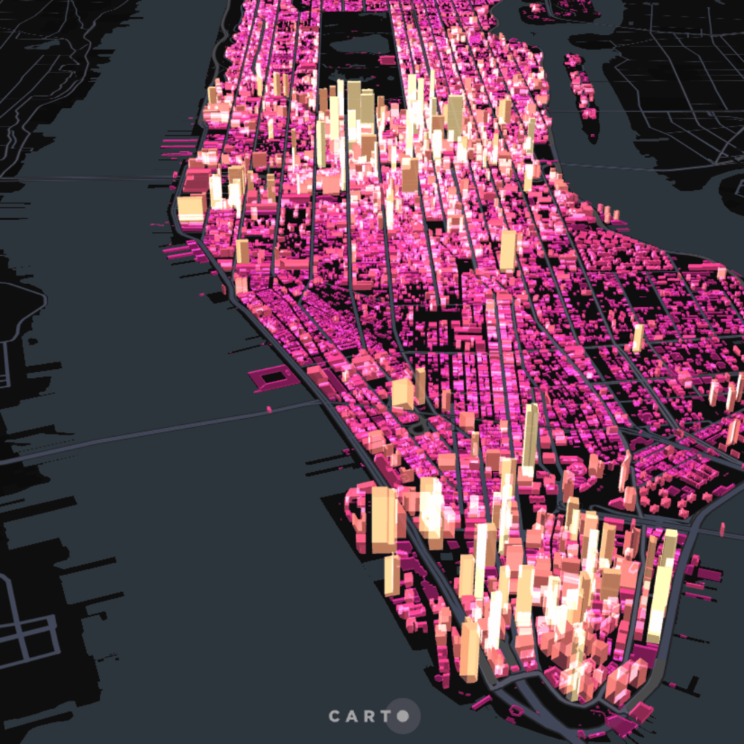 This CARTO Builder map of Overture Maps buildings in Manhattan visualizes the building height variable in 3D at a 1:1 scale - perfect for conveying the scale of the Manhattan skyline! Complete with pop-ups and a series of interactive widgets, map users can easily filter the data to those of interest.