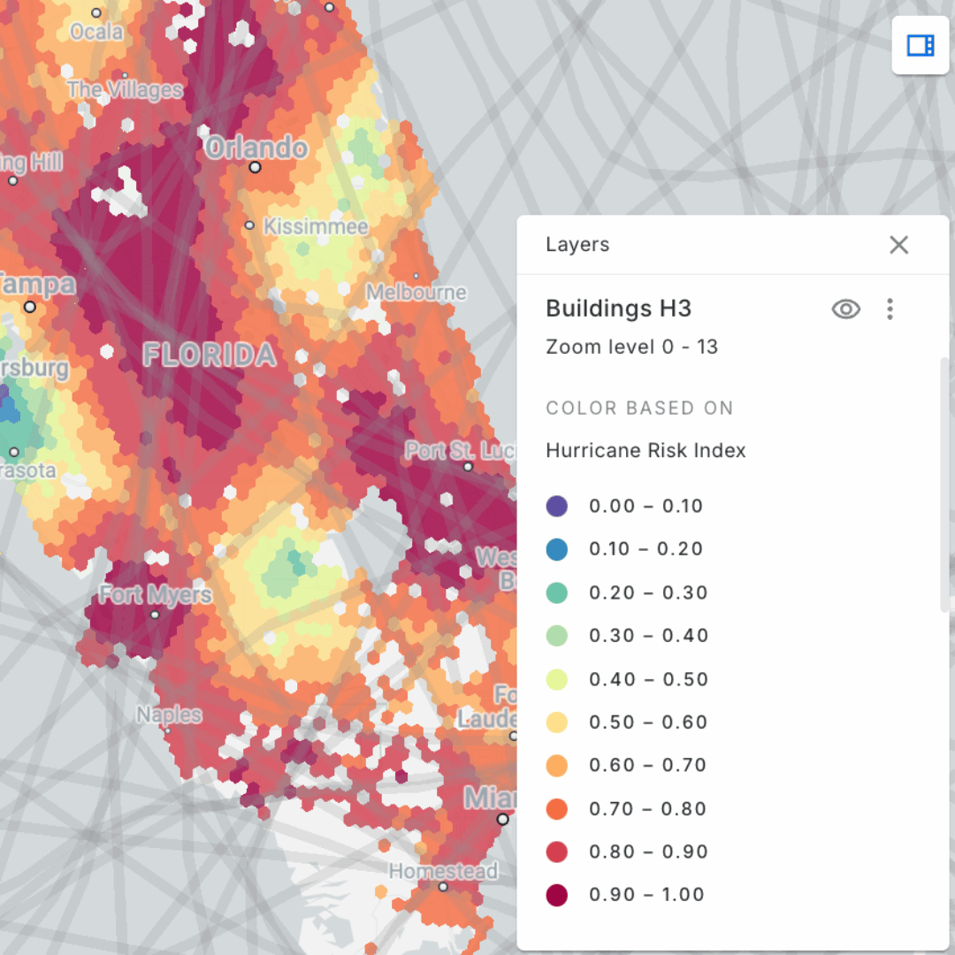 You can see this in action in the demo below. Risk from hurricanes is calculated through proximity to historic hurricane paths with a category of 3 or more. When zoomed to view the entire state of Florida this risk level is aggregated to a H3 grid, allowing the user to understand state and regional level trends. As you zoom in, individual buildings become clear allowing for much more granular insights.