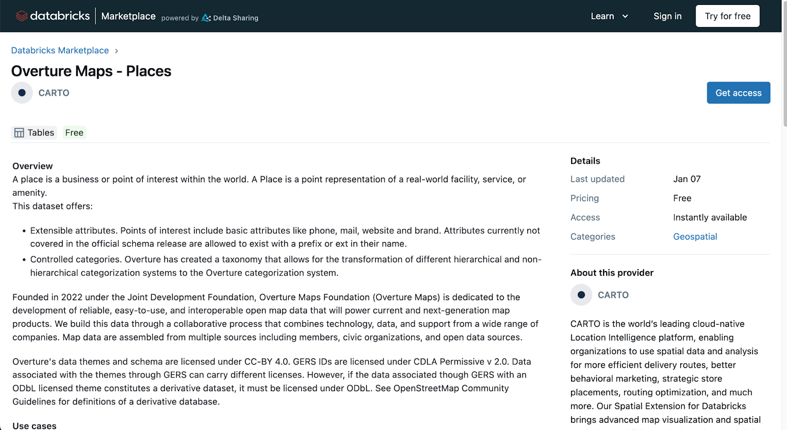 We’ve been working with Overture Maps, Google Cloud & Snowflake to solve this problem and in April 2024, we announced that you can now access Overture Maps data seamlessly in Google Cloud’s BigQuery and Snowflake! Users can effortlessly tap into all Overture Maps data themes without the need for ETL processes, directly linking to the data via SQL queries and CARTO Workflows. Maintaining the original schema closely, updates align with Overture Maps's monthly releases.