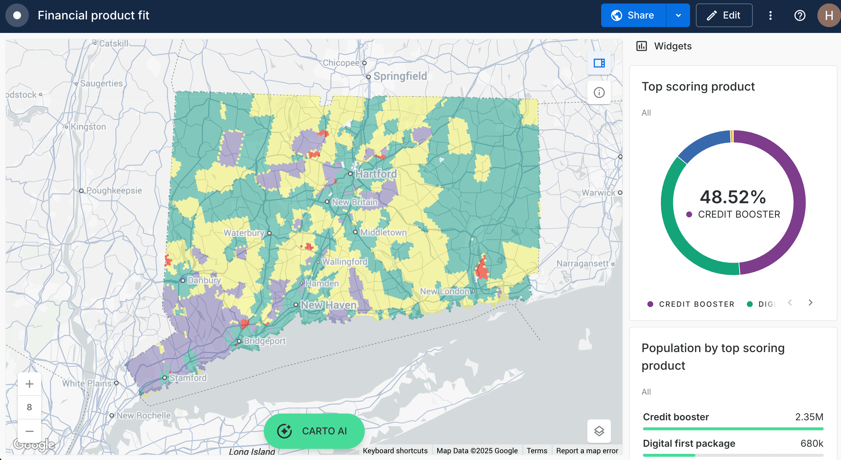 Using this map, you can clearly identify the top product for different areas, whether that’s credit boosters in Hartford or high investment accounts in the southwest - this information is ideal for boosting ROI on product rollouts, marketing campaigns and resource allocations.