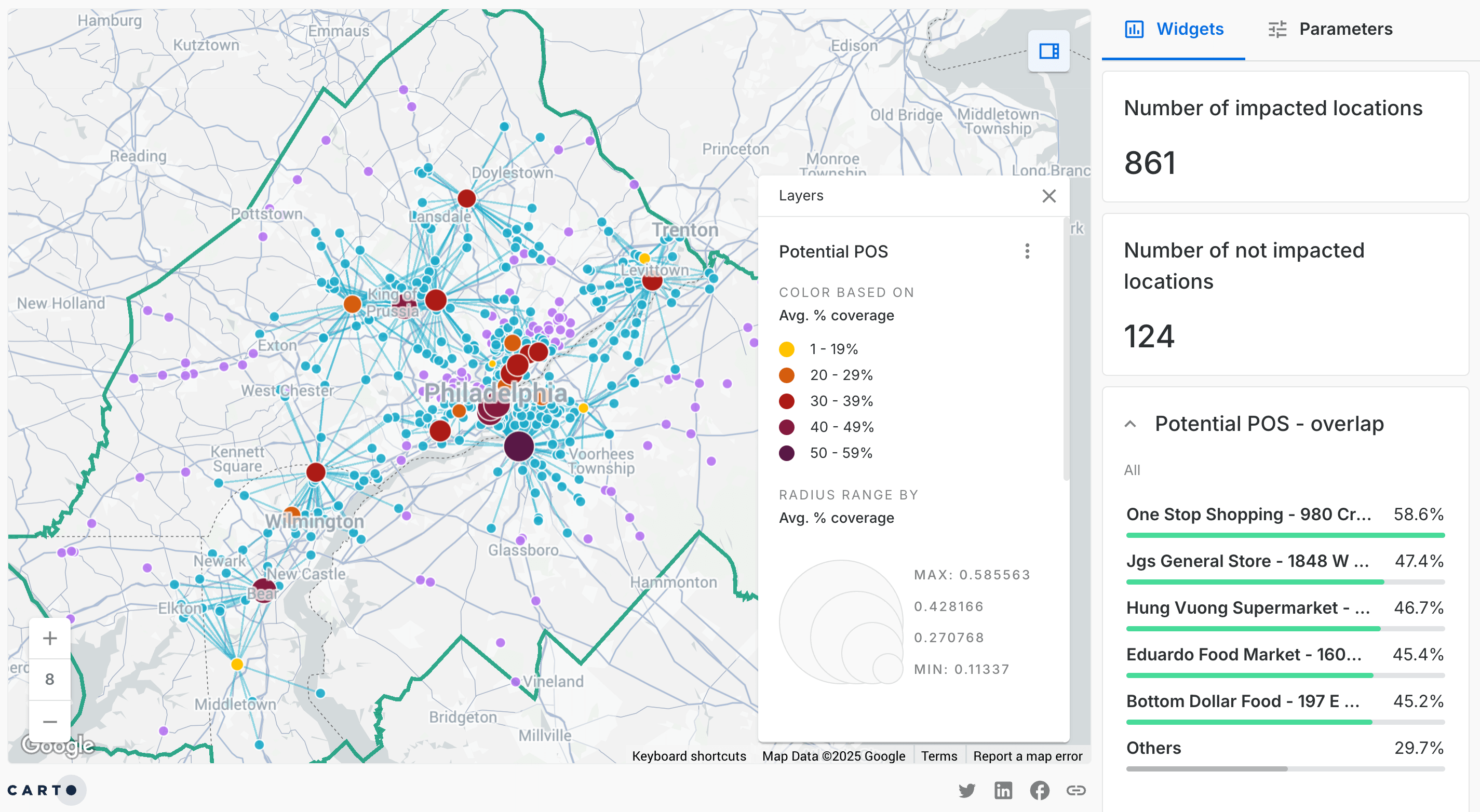 This concept is illustrated in the example above, where CARTO is being used to understand how adding new point of sale to a CPG network might impact existing ones around Philadelphia. By modeling catchment areas and overlaying population data, it’s possible to identify where new merchants risk drawing customers away from current locations.
