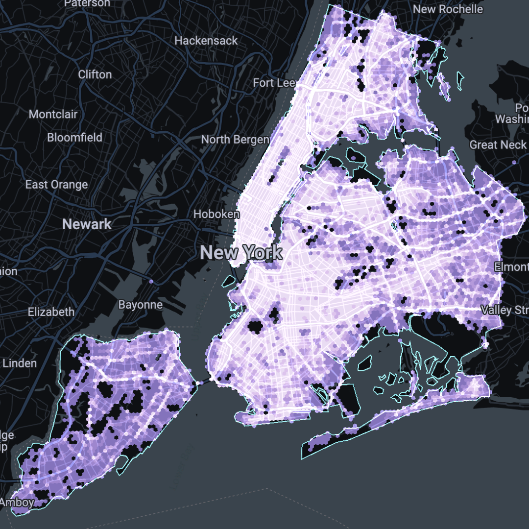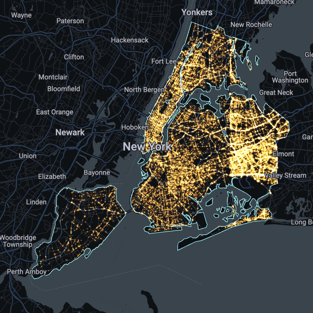 Secondly, you’ll need a dataset which you want to investigate! Any dataset with both space and time dimensions will work. In this example, we’ll be looking at spatial-temporal trends in the 1.8 million vehicle collisions which occurred in New York City from 2012-present (visualized in the map below, or open in full screen here). We’ll be investigating whether certain parts of the city experience more vehicle collisions at certain times of the day. This example is helpful for use cases such as transport planning or urban design.