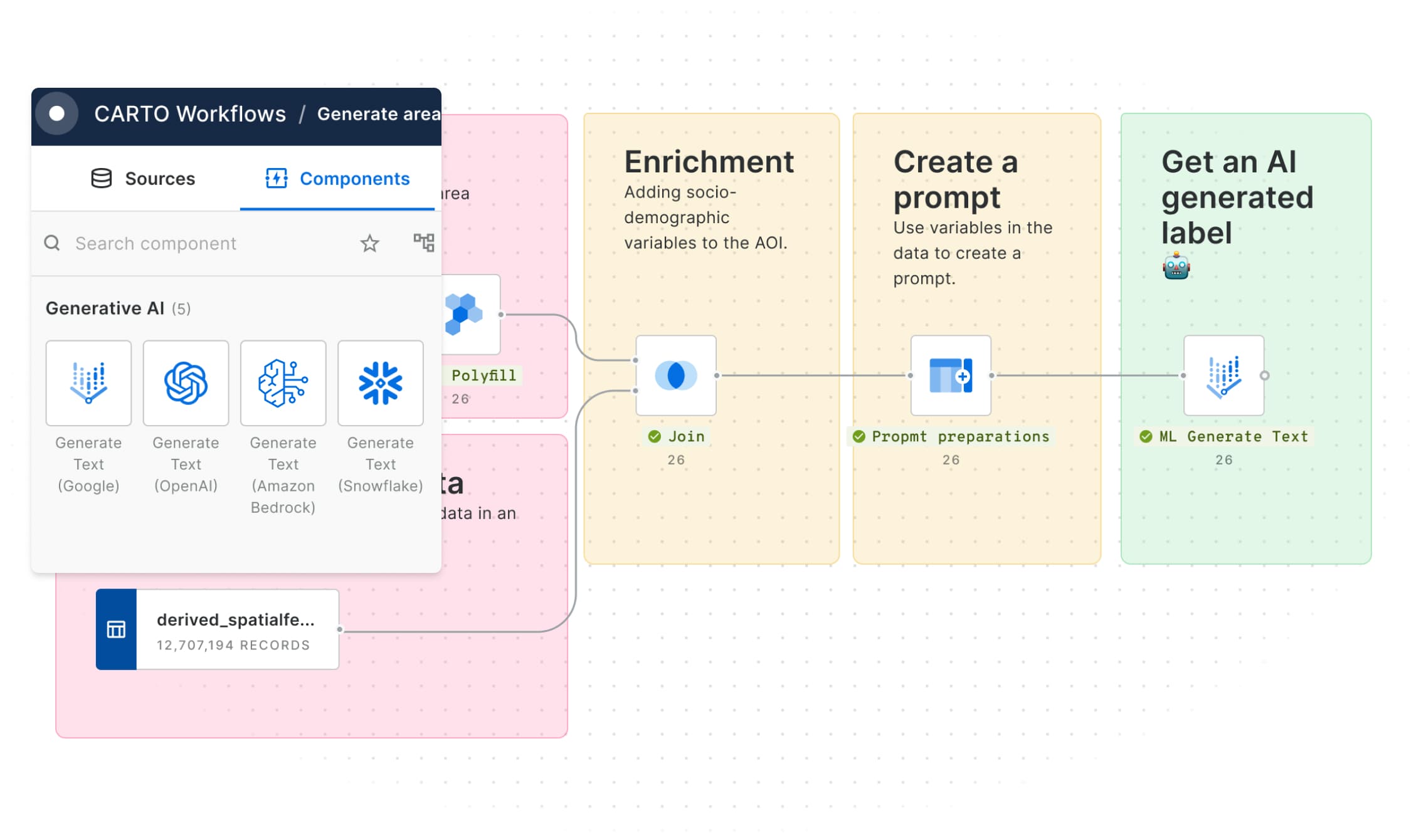 Spatial analysis shouldn't mean deep code or long timescales. Build & iterate faster with Workflows’ hundreds of low-code analytical components - from data prep to Spatial Indexes, ML, and GenAI.